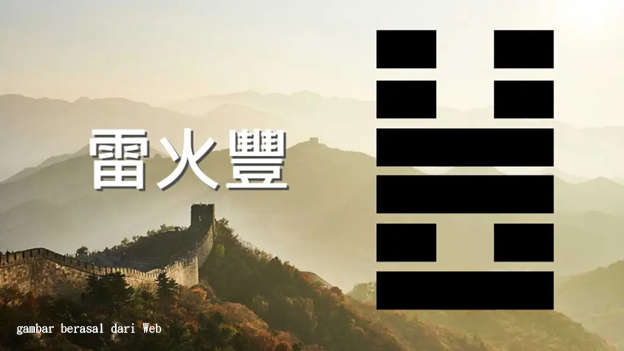 Heksagram Feng tersusun dari trigram Guntur di atas dan Api di bawahnya. Tiongkok kuno memaknai kemunculan bersama guntur dan api sebagai penegakkan hukum. Gua sebaliknya adalah Shi Ke (噬嗑), tersusun dari trigram Api di atas dan Guntur di bawah, adalah perdebatan di pengadilan, juga merupakan kemunculan bersama guntur dan api. Jadi kemunculan Gua ini ada unsur menegakkan hukum dan memberi ganjaran setimpal kepada para penjahatnya.