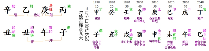 Dalam tanggal lahir ini, terdapat dua buah huruf kerbau (丑), satu kuda (午) dan diperkirakan lahir pada jam tikus (子). Diri logam keras mengandeng kayu kecil (乙) yang mewakili harta. Kayu kecil dalam tanggal lahir ini berfungsi sebagai komando atas kekuasaan (制殺) dan tidak boleh dijadikan target yang harus didapatkan. Jika itu dilakukan, dirinya akan kehilangan senjata untuk mengendalikan kekuasaan, bahkan berbalik menyerang dirinya sendiri.